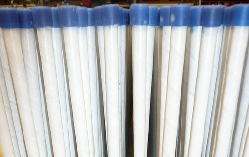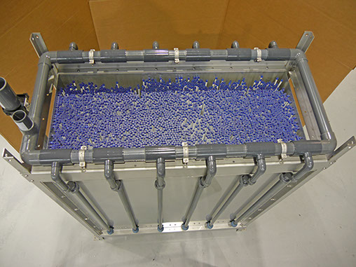 Basis unserer MEMSUB Membranelemente (ME-S) sind unsere selbst hergestellten Rohrmembranen (MEMTUBE-SUB). In den Membranelementen werden unsere Rohrmembranen mit außen aufgebrachter Membranbeschichtung (MEMTUBE-SUB) vertikal angeordnet und am unteren Ende in einen Permeatsammler eingegossen. Die Permeatsammler sind mit Lüftungsschlitzen versehen um eine sichere Durchströmung des Luft/Schlammgemisches zu erzielen. Das obere Ende der Rohrmembran wird einzeln verschlossen und die Membranenden können sich frei bewegen. Eine Verblockung der Membranen mit Fasern und Schlamm kann so sicher vermieden werden.